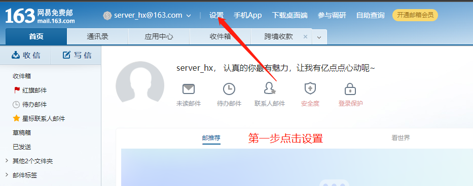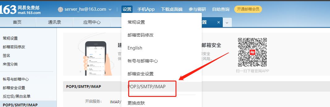 第一步、登录邮箱mail.163.com并点击设置按钮,打开Pop3设置,如下图