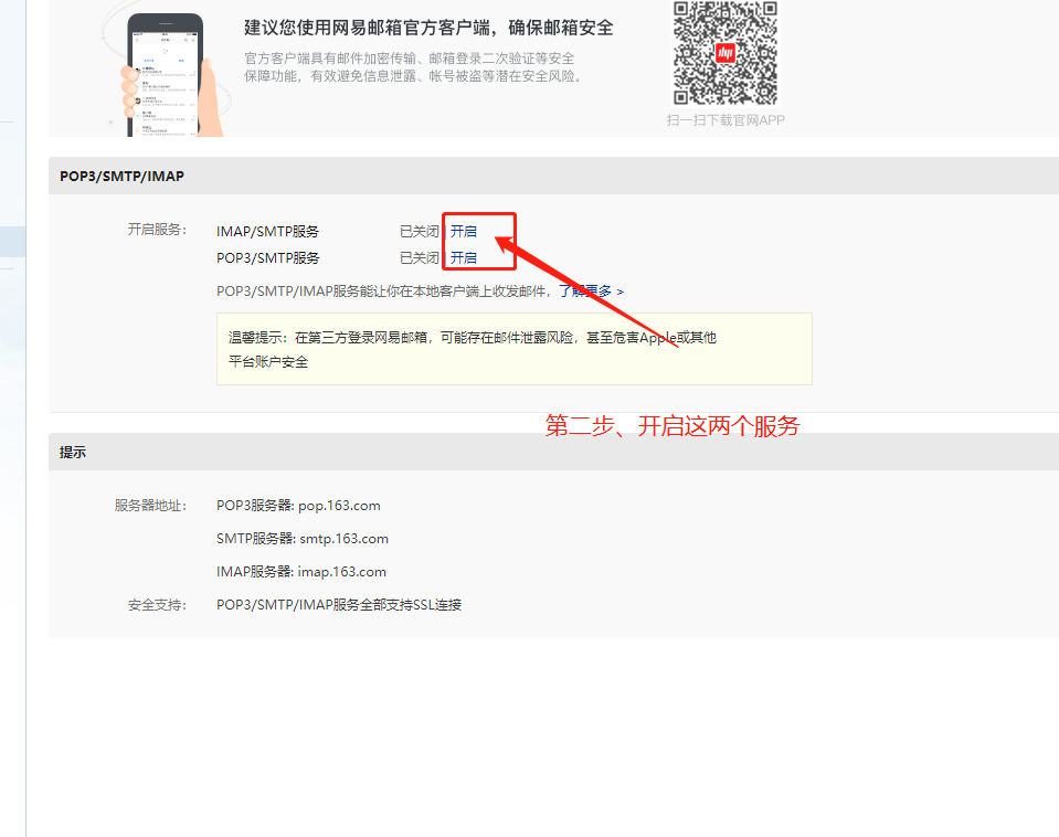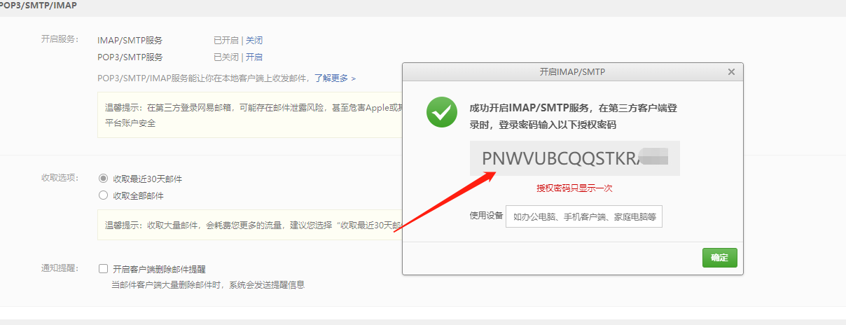 第二步、开启pop3服务,如下图,并且记录第二张图显示的字符串,他是发送密码